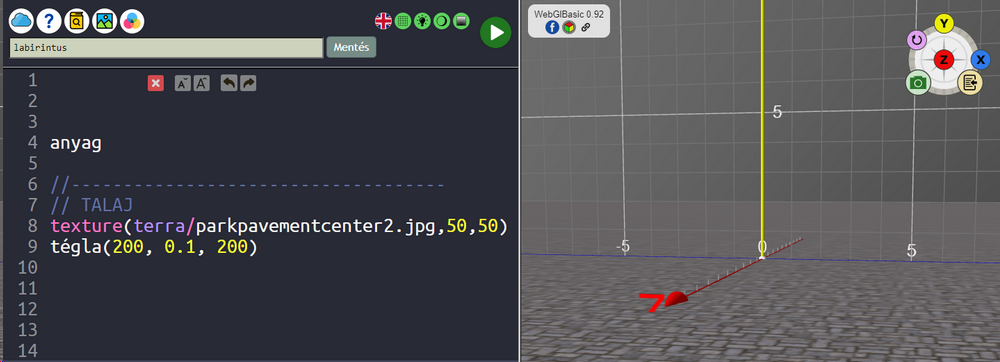 6. A VEZÉRLÉS utasításban kell megadni, hogy a modell az FPV mozgást engedi meg, vagyis a négy db nyíllal lehet mozogni a talaj felett, és az X gombbal ugrani. Programozás közben a fordítás után rá kell kattintani a kamera kék START gombjára, hogy utána működjenek a gombok! Ezután már csak sétálni lehet a 3D térben, de még a falakon át lehet menni.