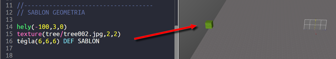 2. A sablon egy 6x6x6 méteres kocka lesz. Az x=-100 helyen már biztos nem lesz labirintus, és nem fog látszani. Lehet távolabbra is rakni, ha a labirintus nagyobb lenne. A DEF kulcsszóval nevezzük ezután SABLON-nak. A sablon bármilyen geometria lehet, nem feltétlenül kocka. A későbbiekben ezt fogja a program másolni a térképen megadott pozíciókba.