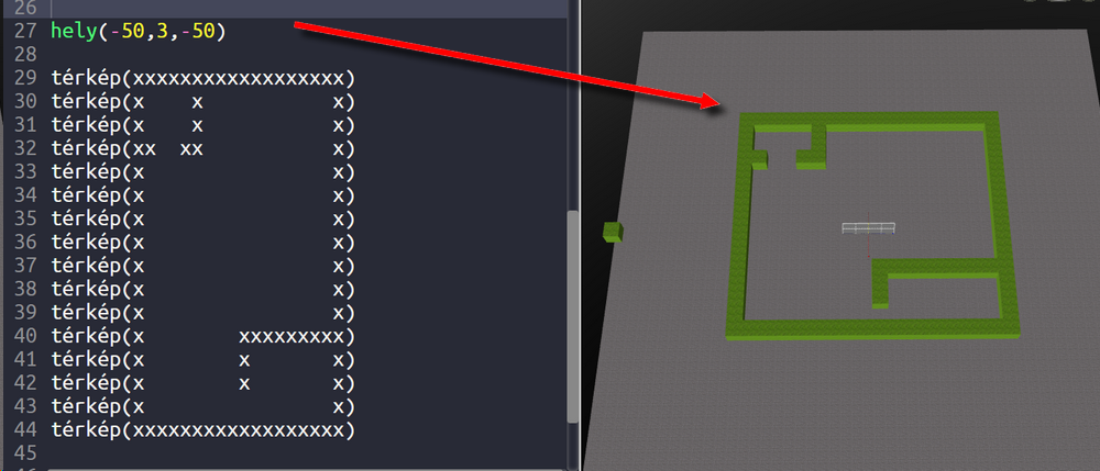 A labirintus alakját a karakteres térkép adja meg. A HELY utasítás a labirintus bal felső sarkának helyét rögzíti. Innen számolva minden oszlop a térképben 6 méterrel növeli az X koordinátát, illetve minden sor 6 méterrel a Z koordinátát. Az üres részeken szóköz van!