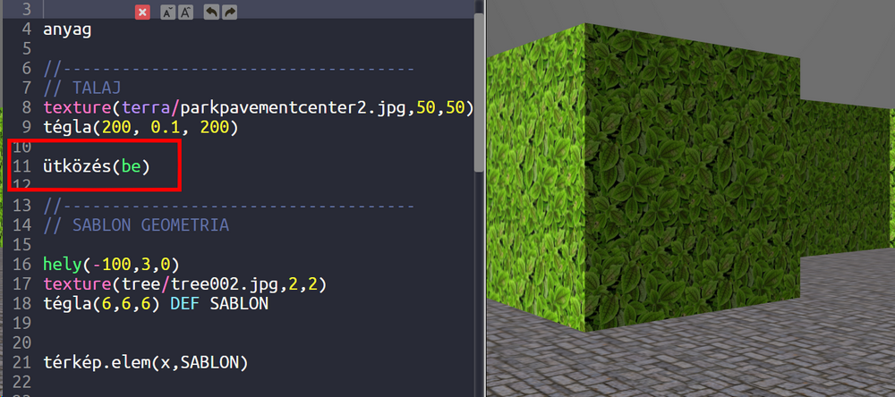 7. Sokkal reálisabb lesz az FPV hatás, ha a falakon nem lehet átmenni. Be kell kapcsolni az ütközés engedélyezését. A parancs úgy működik, hogy attól a sortól lefelé, ahol bekapcsoltuk az ütközést, minden generált testtel ütközhet a kamera. Ezért a talaj, és a sablon geometriája közé kell utólag beírni az utasítást.