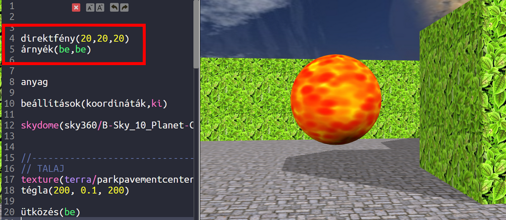 Erősebb gépen meg lehet próbálni az árnyékok bekapcsolását is. Kell egy direktfény, és utána be kell kapcsolni az árnyékokat. Ezeket is kód elejére kell beszúrni.