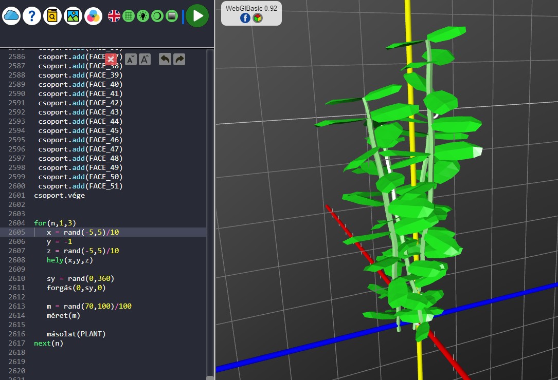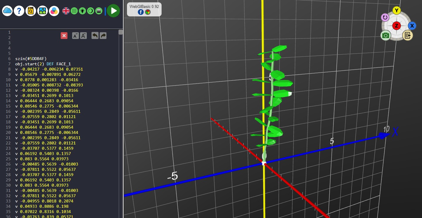 Ezután csak be kell illesztened a vágólapról a WebGlBasic szerkesztőbe a sok OBJ formátumú geometriát. A végén egy PLANT nevű csoportba helyezi a konverter az összes elemet azért, hogy az egész növényt egyben lehessen kezelni.