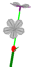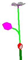 Inflorescence. Bud’s work is done. He has created an inflorescence and has taken the rest of the plant’s life off. Now Flora the inflorescence (shown here in light green) is going to work producing two lovely flowers. She demands biomass to reach her full size, but she doesn’t put any biomass into the flower buds – she works entirely on a schedule. You could say that her biomass includes enough biomass to “start out” each flower bud. She has two flower buds to create (Inflorescences: Number of flowers) and several days to create them (Inflorescences: Days for all flowers to develop). She’s already made one flower in this picture. |
