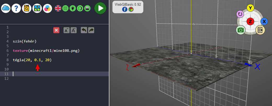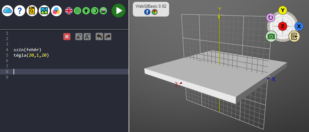 A TÉGLATEST, vagy röviden TÉGLA utasítás 3 paraméteres: szélesség, magasság, mélység, azaz x,y,z kiterjedés. Ha valamelyik kiterjedést nagyon kicsire állítjuk (0.001), akkor szinte sík lapot kapunk.