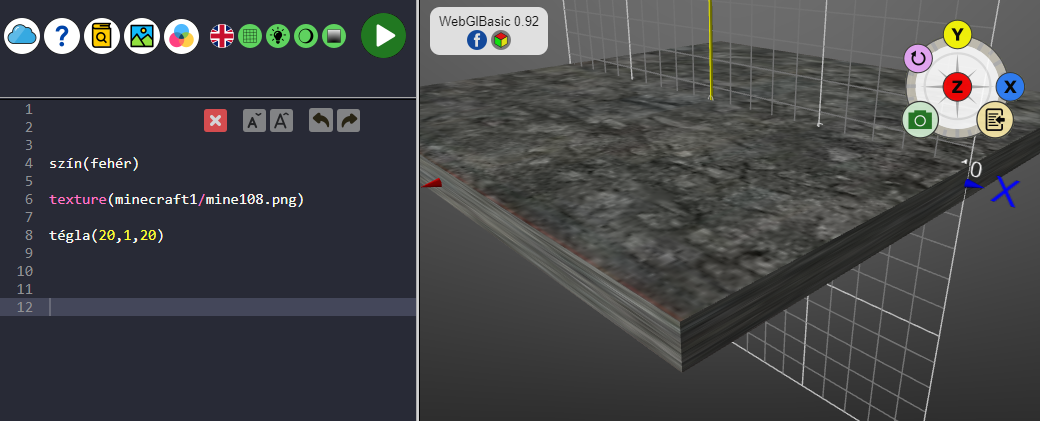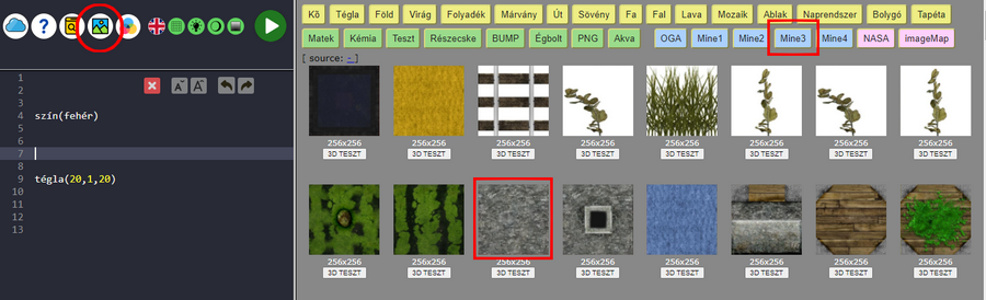 Most a téglatest felszínére egy textúrát helyezünk. Ezt az utasítást nem kell begépelni, mivel egérrel az adott textúrára kattintva a kurzor helyére másolódik a megfelelő kód.