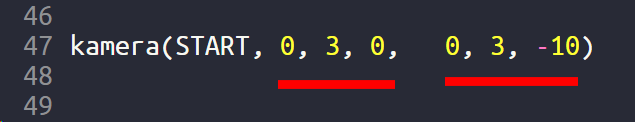 5. Most készítünk egy olyan kamerát, ami a játékos alaphelyzetét adja meg. A kamera neve START lesz, majd utána 2x3 koordináta van. Az első 3 a nézőpont helye, a második, hogy hova néz a kamera. A példában 3 méter magasan lesz a kamera, és a középpontból a Z=-10 irányba néz.