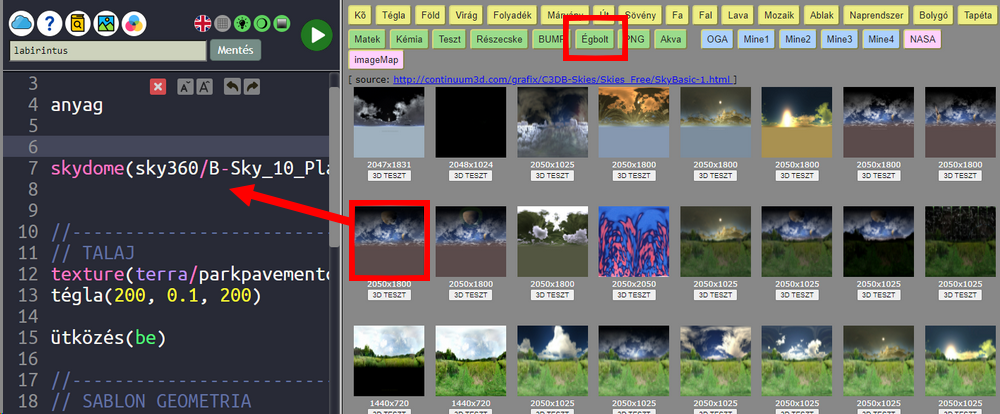 A beépített textúrák ablakban az Égbolt kategórián belül kell a kis mintaképre kattintani, és a program automatikusan beszúrja a kurzor helyére a megfelelő utasítást.