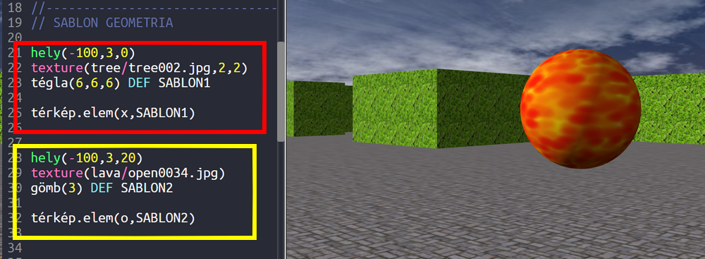 2. A sablon egy 6x6x6 méteres kocka lesz. Az x=-100 helyen már biztos nem lesz labirintus, és nem fog látszani. Lehet távolabbra is rakni, ha a labirintus nagyobb lenne. A DEF kulcsszóval nevezzük ezután SABLON-nak. A sablon bármilyen geometria lehet, nem feltétlenül kocka. A későbbiekben ezt fogja a program másolni a térképen megadott pozíciókba.