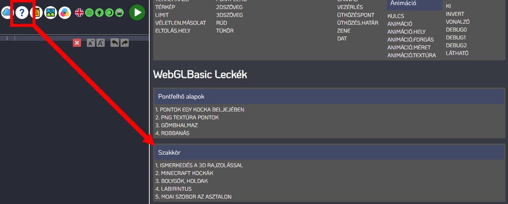 A teljes, működő kódot a súgóból is be lehet másolni a szerkeszőtbe. A Szakkör csoportban található az egyes foglakozások programjai.