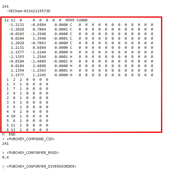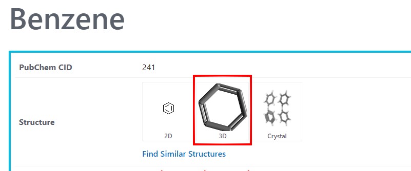 Az SDF formátum 3D kémiai modellek leírására alkalmas szövegfájl. Tartalmazza az atomok koordinátáit, és a kötéseket is. Az egyik legnagyobb ingyenes gyűjtemény a https://pubchem.ncbi.nlm.nih.gov/ oldalon található. A keresőbe írhatsz kémiai képleteket, vagy angol neveket is. Például a benzint így is lehet keresni: benzene vagy C6H6.