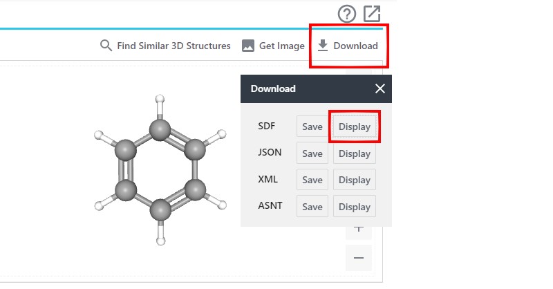 A sikeres találat után már látható, hogy van-e 3D formátum az adatbázisban. Ha van, akkor a 3D megjelenítő jobb felső sarkában a download – SDF – display linkkel külön ablakban betöltődik a szövegfájl.