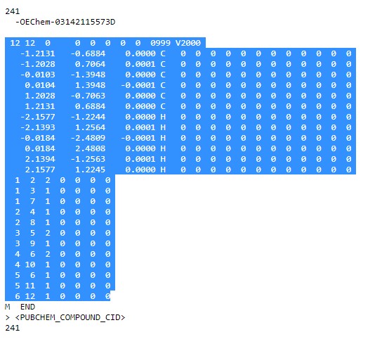 Innen kell átmásolni a WEBGLBASIC szerkesztőbe a lényeges adatokat. Kb. a 4. sortól kezdődik a fejléc, ami az atomok, és a kötések számát tárolja. Innen kell kijelölni az utolsó kötés soráig.