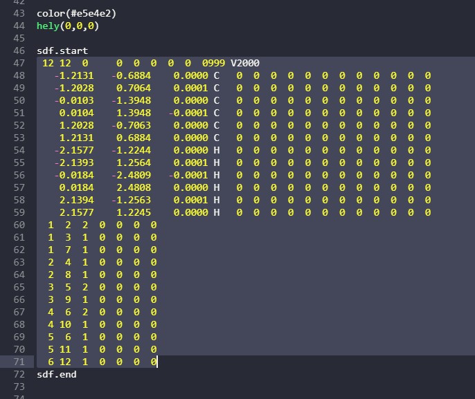 Az SDF utasítás a prototípus geometriákat fogja klónozni annyi példányban, ahány atom van a leírásban.