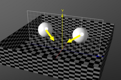 RUGALMASSÁGAz ütközést befolyásolja a test rugalmassága. Ezt a test kódja előtt kell beállítani. Valóságos szimuláció esetén 0..1 közötti szám legyen. A példában minden gömb más rugalmasságot kapott. A hátul lévő gömb minden ütközéskor egyre magasabbra ugrik, mert a rugalmassága 1-nél nagyobb. Ne feledjük, hogy a padlónak, vagyis a doboznak is van rugalmassága!