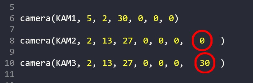 Módosítottam a kamera utasítást. Eddig 7 paramétert lehetett használni. Az első a kamera neve volt, majd 3 koordináta a kamera helye, és 3 koordináta a kamera célpont volt.