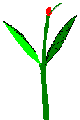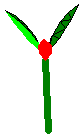 First day. Bud begins life and receives his first dose of biomass1UCKPV3. Since the plant has not yet started its reproductive mode, Bud is vegetative. He wants to make internodes13R8I1K and leaves. Because the plant has alternate leaf arrangement (the parameter Meristems: Axillary meristem and leaf arrangement is “alternate”), he only wants to make one leaf per internode. The internode and two leaves you see here came directly from the seed. At this point Bud only has to compete for new biomass with the first internode and the seedling leaves. |
