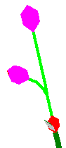 Third internode. As you can see, Bud’s way up at the top of the plant, and he’s just made his third internode and leaf. Those dark-red meristems you see are axillary meristems. The internodes and leaves he already made are now competing with Bud for new plant biomass as they try to reach their maximum size. These maximum sizes are specified by the parameter Optimal final biomass in both the Internodes and Leaves parameter sections. |